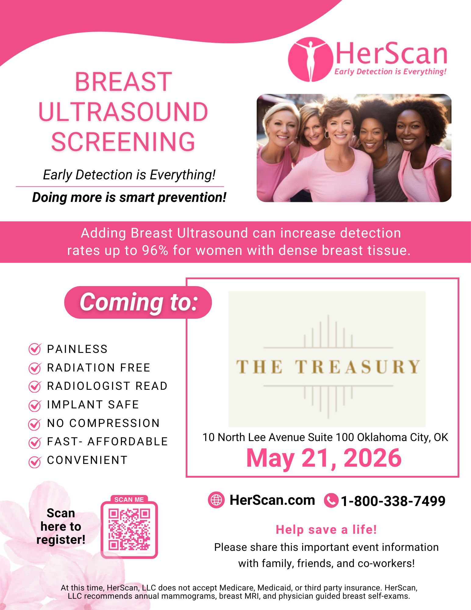 Oklahoma City, OK – May 21, 2026 — Women in Oklahoma City will have access to an important early detection resource when HerScan, a provider of breast ultrasound screenings, comes to The Treasury on May 21, 2026. Breast ultrasound screenings can increase detection rates up to 96% for women with dense breast tissue, offering an additional layer of reassurance beyond traditional mammograms.